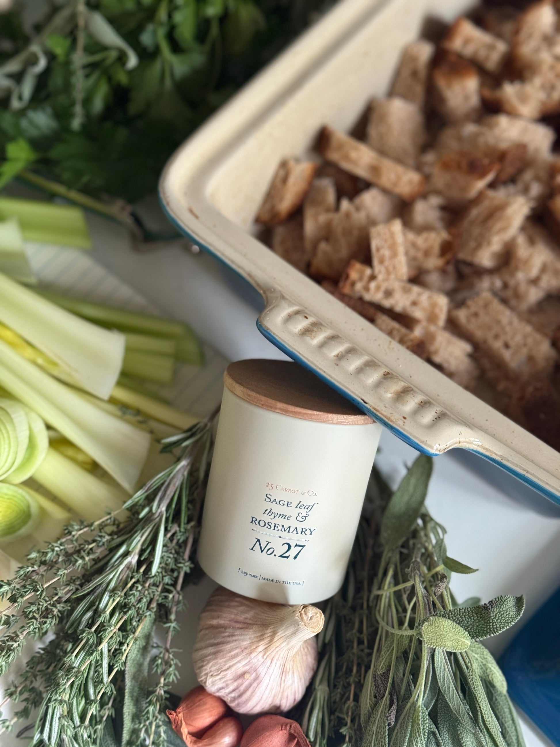 A wonderful candle for Thanksgiving. Like the aroma of opening your oven while herb-filled stuffing bakes. Elegant and refined scent perfect for November! Batched with love from my home to yours! *100% soy wax, made in the USA; etched glass with wood lid.